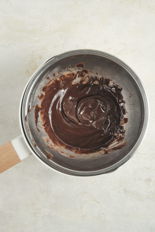 - In a heatproof bowl set over a saucepan of simmering water, combine the chopped chocolate, vanilla extract, and unsalted butter. Stir until smooth and fully melted, then remove the bowl from the heat and let it cool slightly.