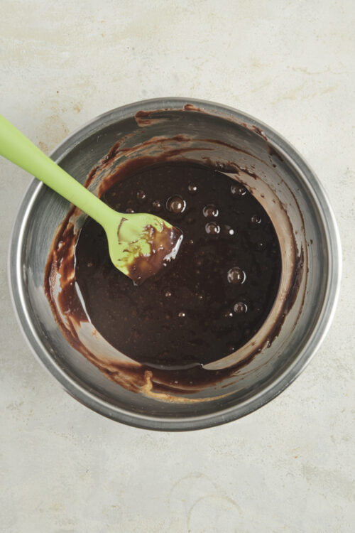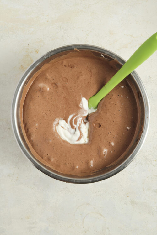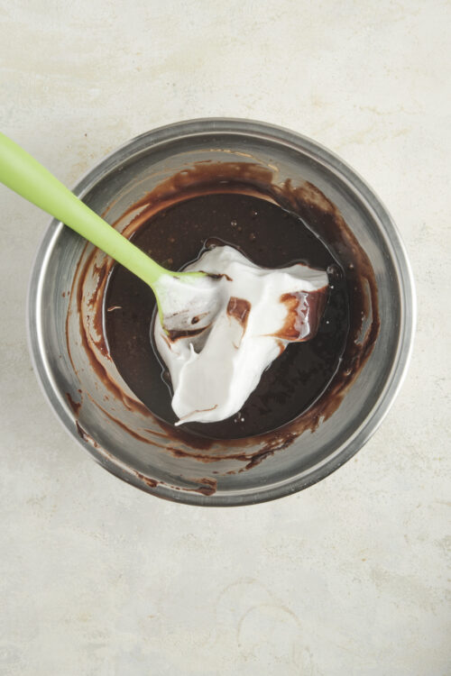 - Gently fold the beaten egg whites into the chocolate and yolk mixture. Use a rubber spatula and fold slowly to keep the mixture light and airy.