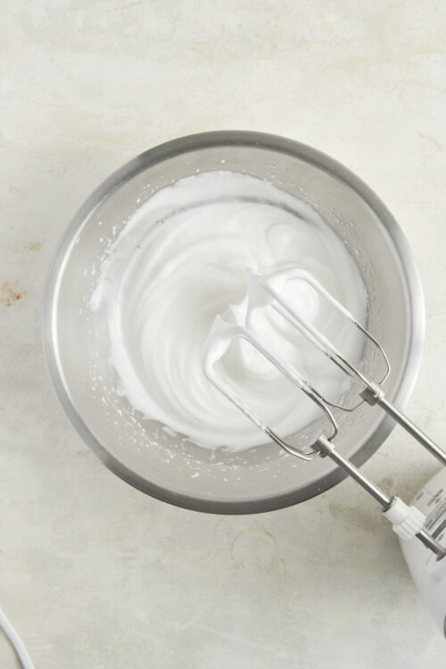 - In a clean bowl, beat the egg whites with 3 tablespoons of granulated sugar until stiff peaks form. Be sure to use a clean, dry bowl and whisk for best results.