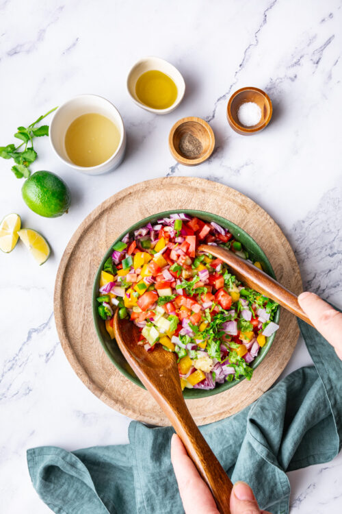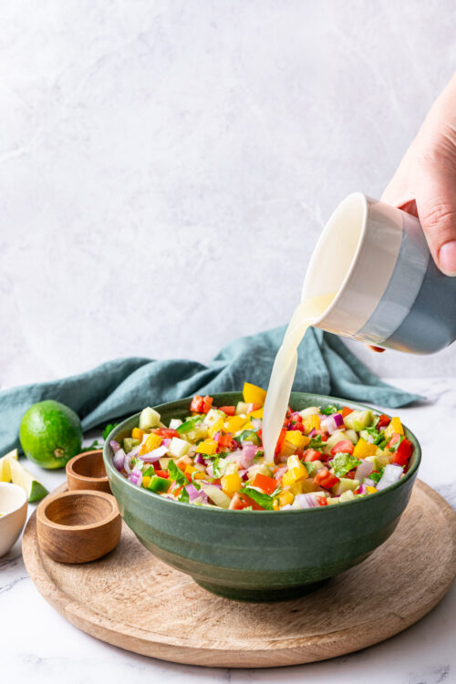 This light, flavorful, and crunchy salsa is a perfect topping or side to so many summer dishes, but it’s also a great snack with a bowl of tortilla chips.