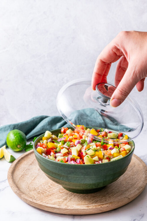 - Cover the bowl and refrigerate for 30 minutes to allow the flavors to meld. If using with tortilla chips, serve chilled and garnish with extra cilantro. Alternatively, serve on tacos or as a refreshing topping for your favorite dishes.