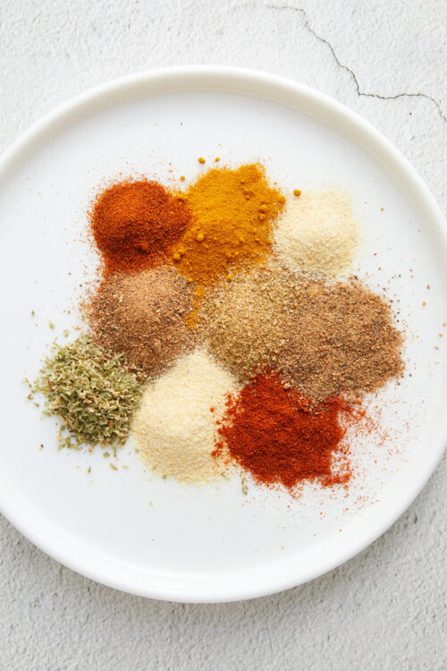 Since it’s such a regular meal at the Porter household, I started mixing my own shawarma spice blend. I used to buy it pre-mixed, but if you use it a lot, those little jars add up. Buying spices in bulk and mixing your own is cheaper and fresher. It also takes almost zero effort.